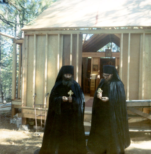 在受剃度後,塞拉芬修士與革爾曼修士於精舍教堂前,1970年10月14/27日。