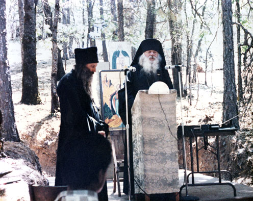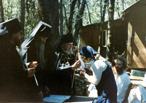 在1980年聖革爾曼夏季朝聖中,塞拉芬神父為安東尼總主教的講話翻譯。前排從左至右:斯皮里東神父,革爾曼神父,羅曼•盧科亞諾夫神父。照片由勞倫斯•威廉神父拍攝。